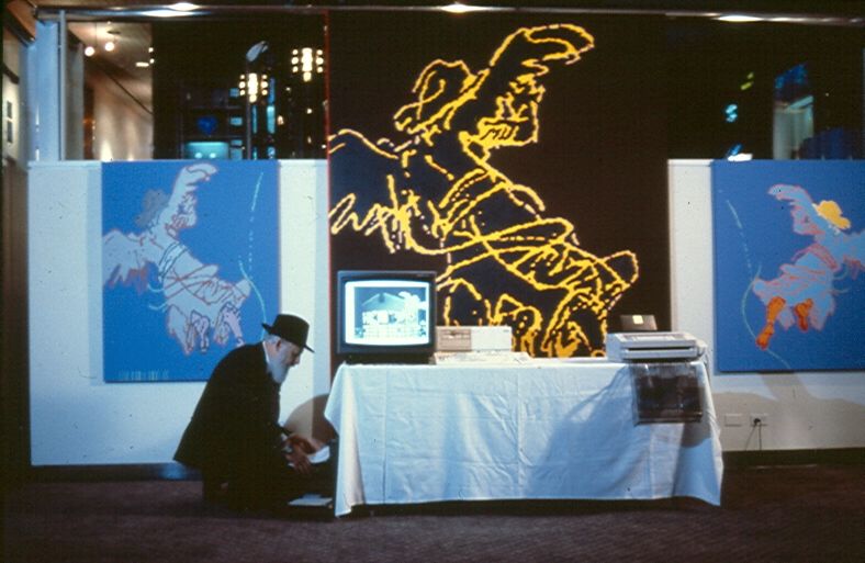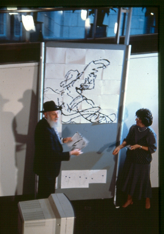 |  | | mel alexenberg and miriam benjamin mounting 28 fax sheets of angel returning to NY from flight through Los Angeles, Tokyo, Jerusalem, Amsterdam |