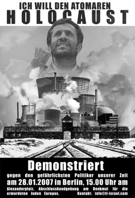 |  | | berlin demonstration to stop a second holocaust before ahmadinejad executes his plan to “wipe israel off the map” with a nuclear bomb |