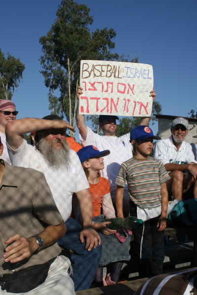 |  | | audience at opening game of first israel baseball league season. sign reads "if you will it, it is no legend," words of theodor hertzl |