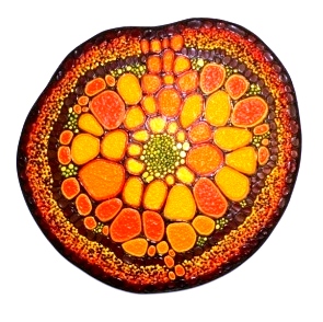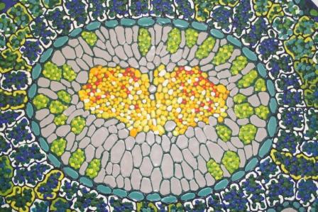 |  | | x-section of pine needle enlarged 600x. encaustic paint on photomicrograph mounted on shaped panel |